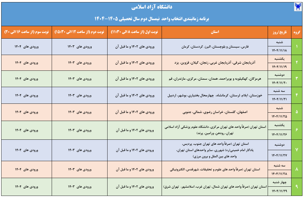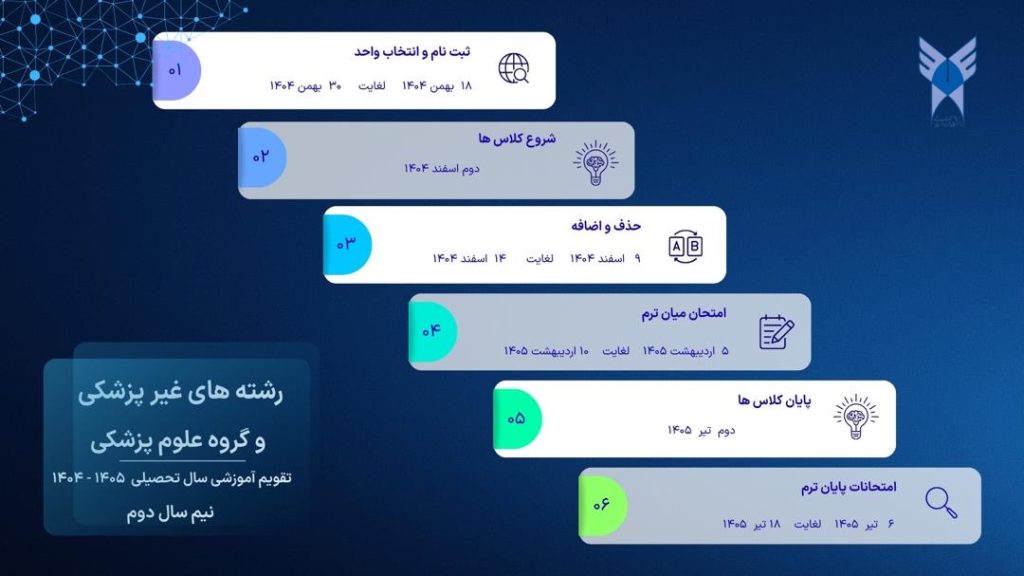 برنامه زمانبندی انتخاب واحد تکمیلی (نوبت دوم) نیمسال دوم سال تحصیلی ۱۴۰۵ ـ۱۴۰۴ دانشگاه آزاد اسلامی